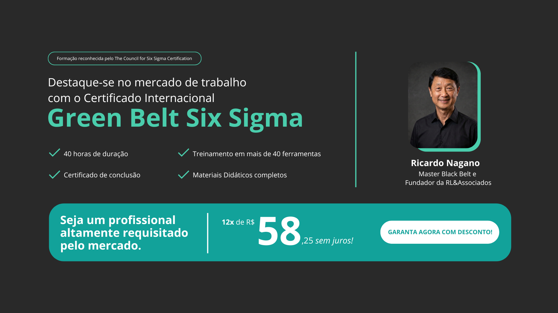 O curso Green Belt 6 Sigma com a RL & Associados tem conteúdo e materiais de apoio muito bons, além da didática do Ricardo Nagano ser espetacular, nota-se que tem total domínio do assunto.